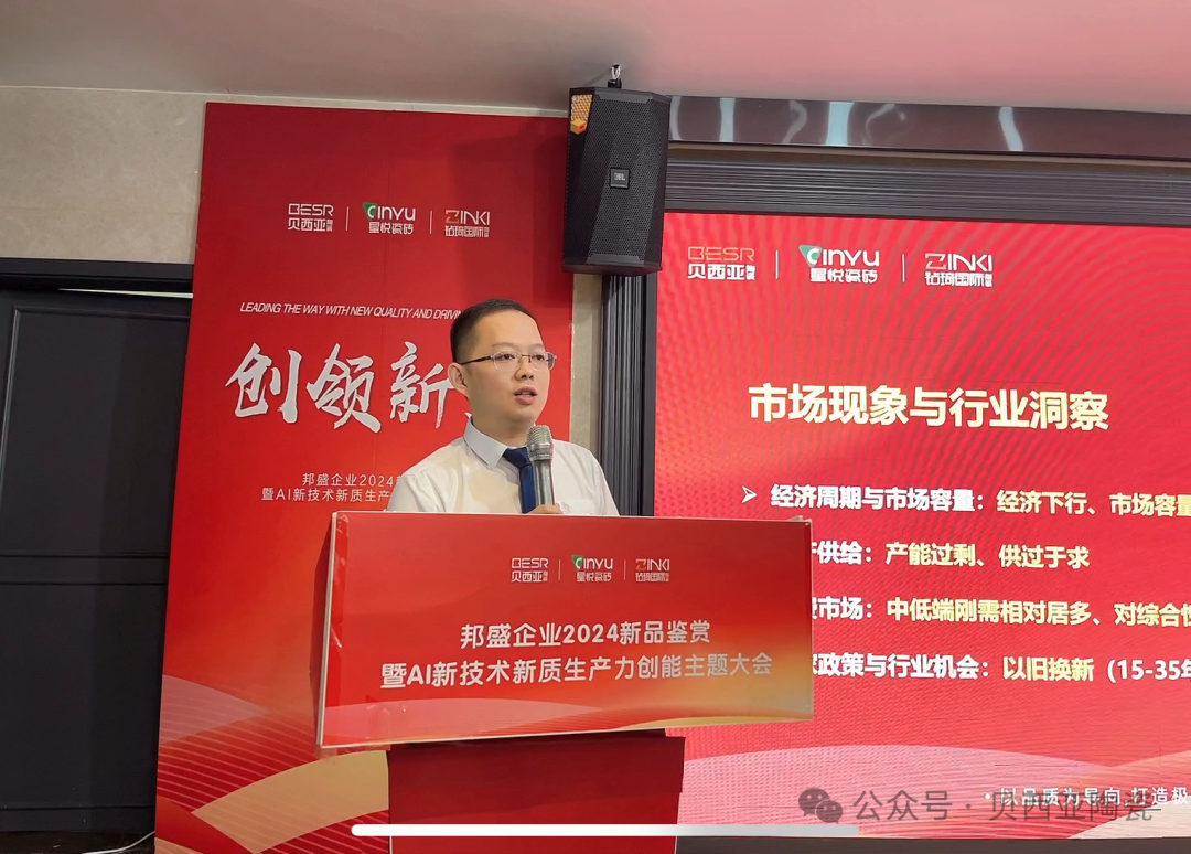 峰會上,眾成事業(yè)部常規(guī)品牌營銷中心總經(jīng)理助理江軍以【瓷造者 · 向新而生】為主題,深度分析當(dāng)前房地產(chǎn)市場的最新變化、市場的價格戰(zhàn)問題、行業(yè)現(xiàn)狀及發(fā)展態(tài)勢等市場問題,通過分析終端態(tài)勢、市場突圍路徑、AI 賦能以及新產(chǎn)品超白坯瓷磚、復(fù)刻釉瓷磚、超防滑瓷磚、天鵝絨瓷磚等新產(chǎn)品的推出,并AI 新技術(shù)為切入點,為品牌以及終端賦能新活力,為新周期下公司與經(jīng)銷商伙伴的共創(chuàng)共享注入全新活力,為品牌高質(zhì)量新發(fā)展創(chuàng)能蓄勢。